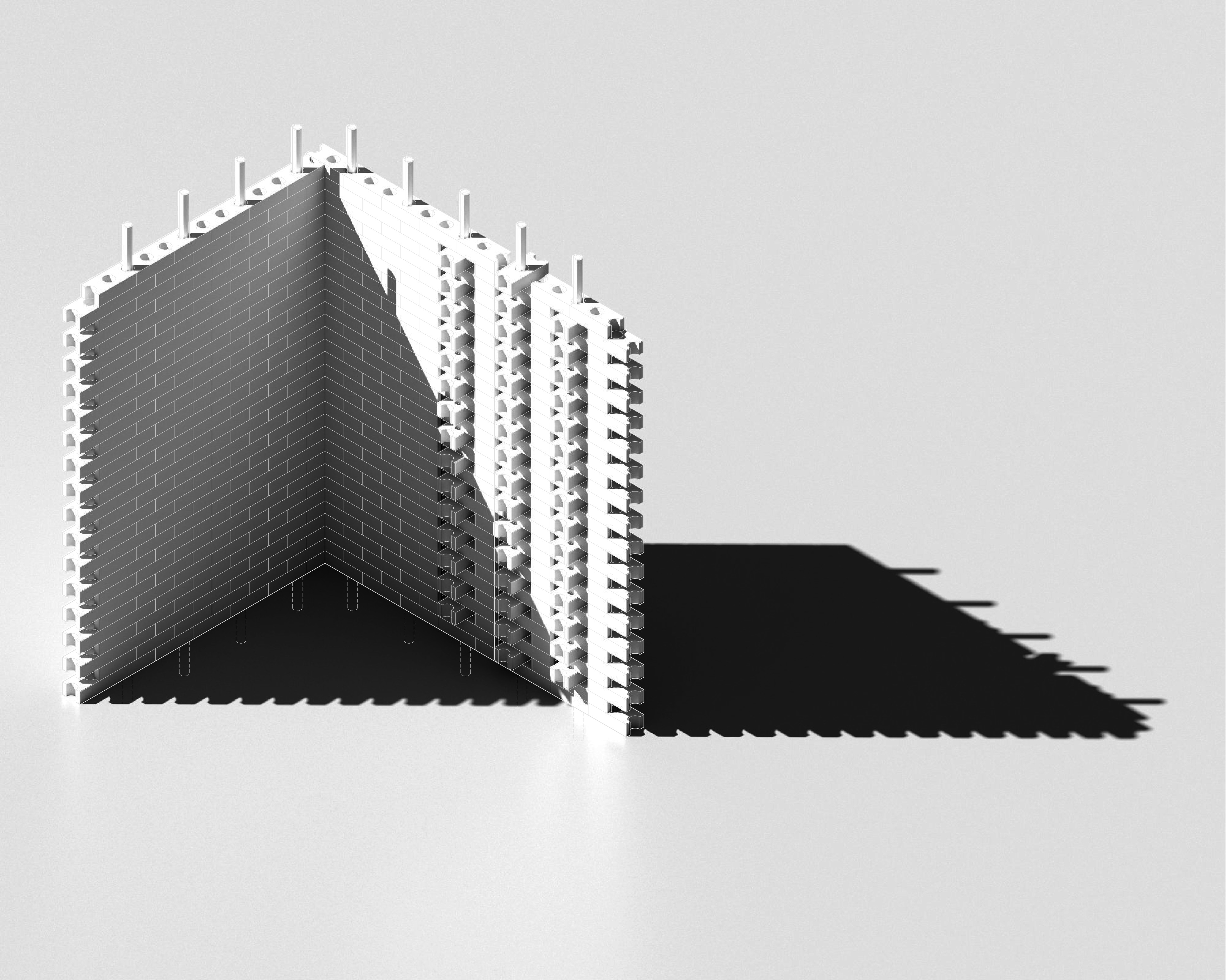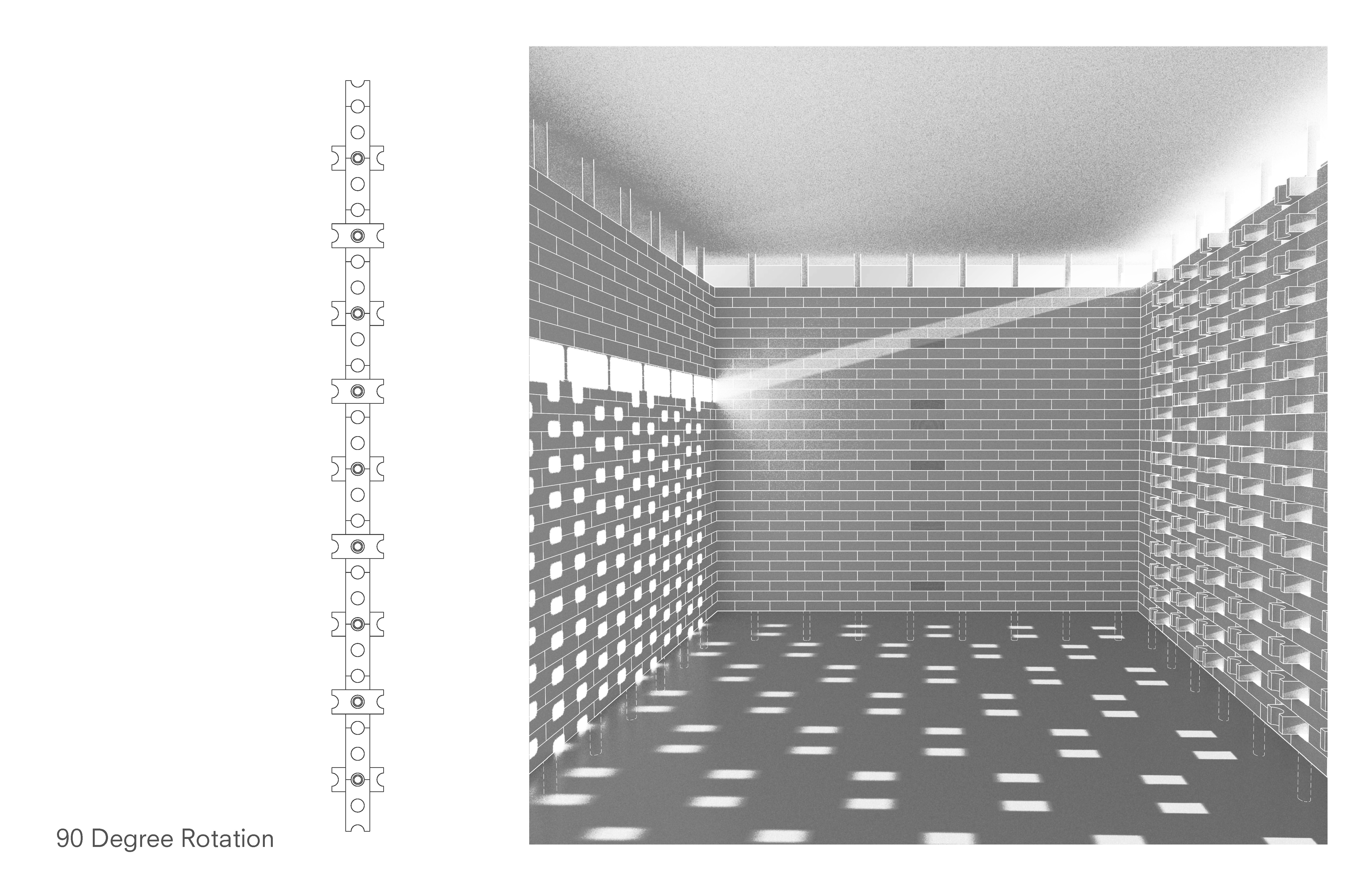 The solution involved a singular brick designed to rotate on a central axis. As you will come to see, this central axis is also part of the buildings structure and ties the buildings floor and roof elements together.